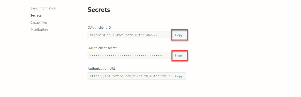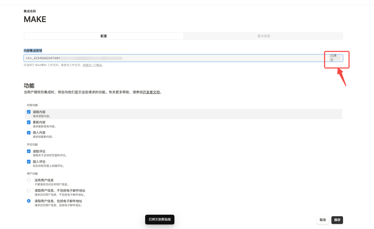 - 找到“内部集成密钥”,单击内部集成密钥旁边的显示,然后复制令牌。将您的令牌存放在安全的地方。