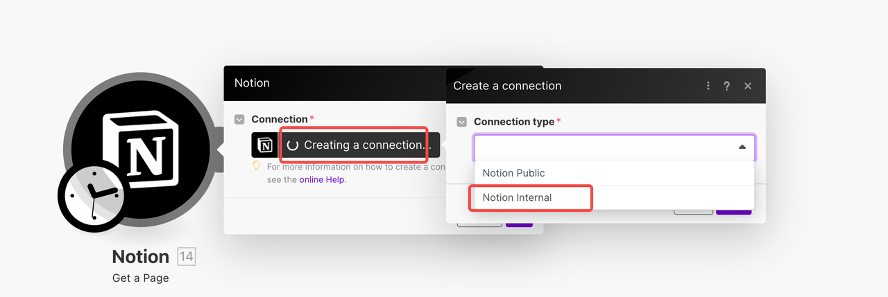 - 登录到您的Make帐户并将 Notion 模块添加到您的场景中,然后单击创建连接。在连接类型下拉列表中,选择Notion Internal 。