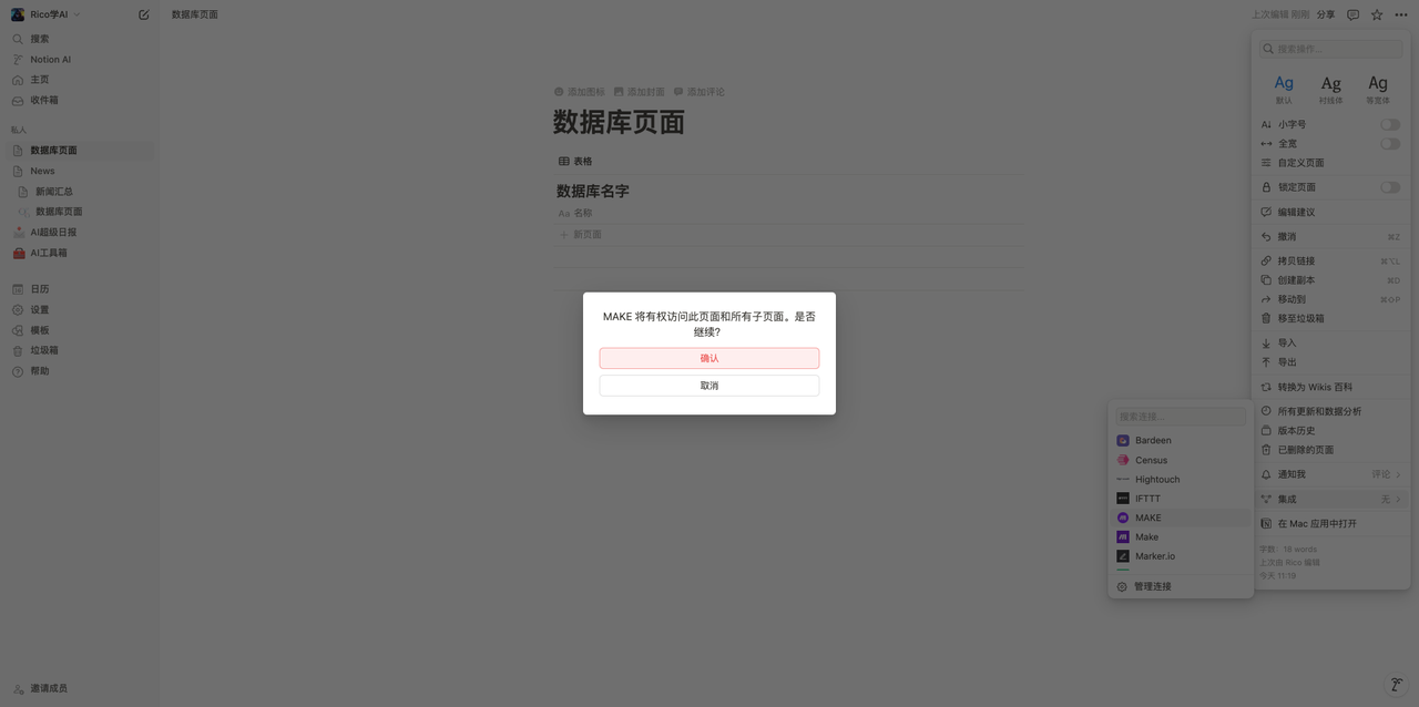 - 登录您的 Notion 帐户。进入您要添加到Make 的数据库,点击右上角的“…“ ,点击集成,点击您之前创建的集成,然后点击确认。⚠️注意:这里选的是你刚刚创建的连接,不要选择官方的Make!!!