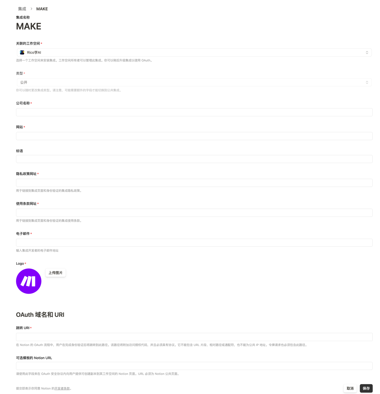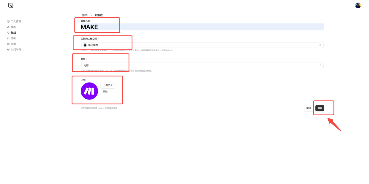 - 单击“新集成”,填写集成名称,选择关联工作空间,选择类型为内部,上传徽标(可选),然后单击保存。点击“配置集成设置”