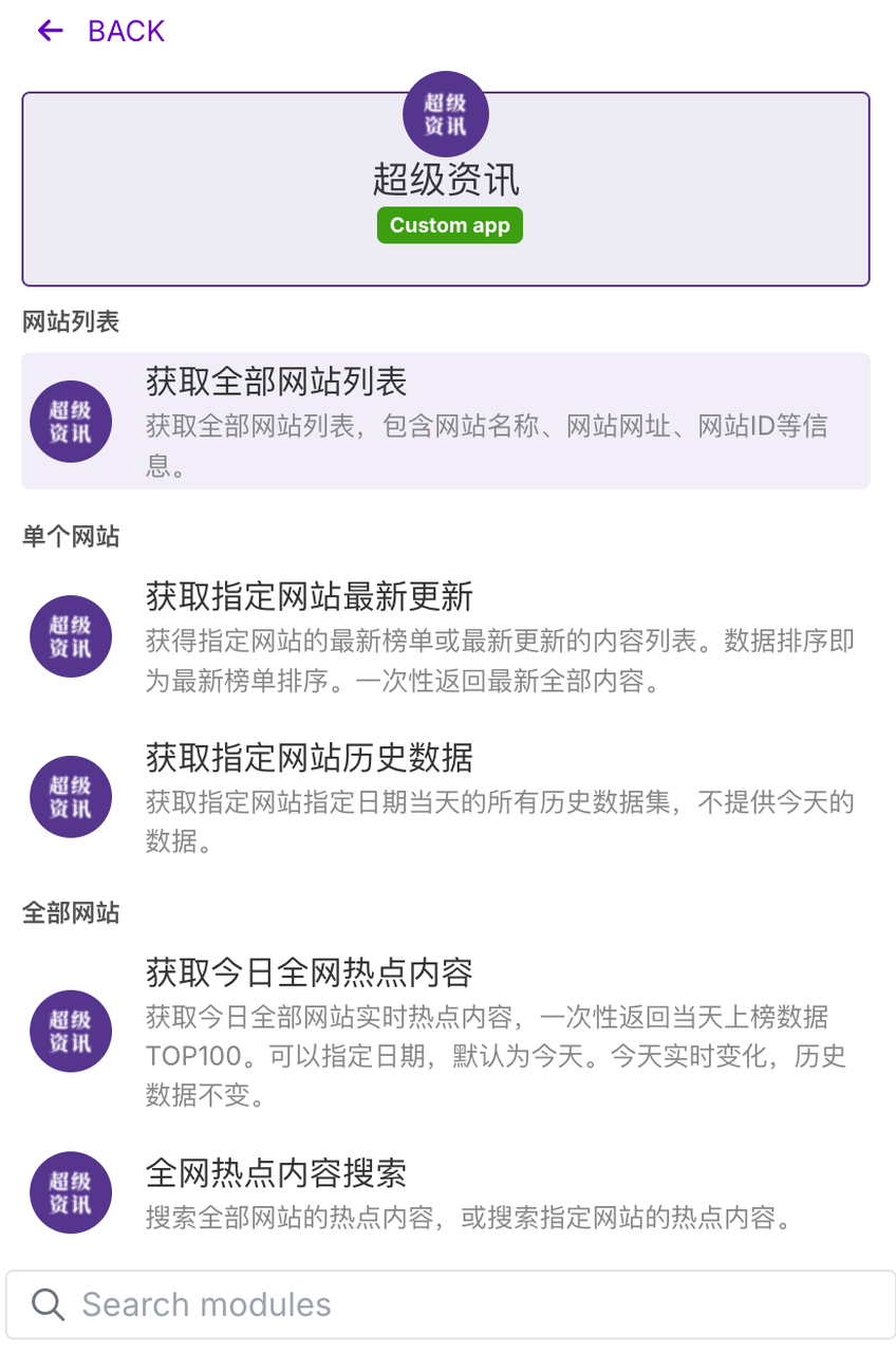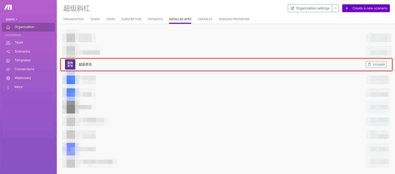 安装后,你可以在组织中心中,看到已经安装成功的应用。你也可以在场景中通过关键词“超级资讯”搜索到该应用。
