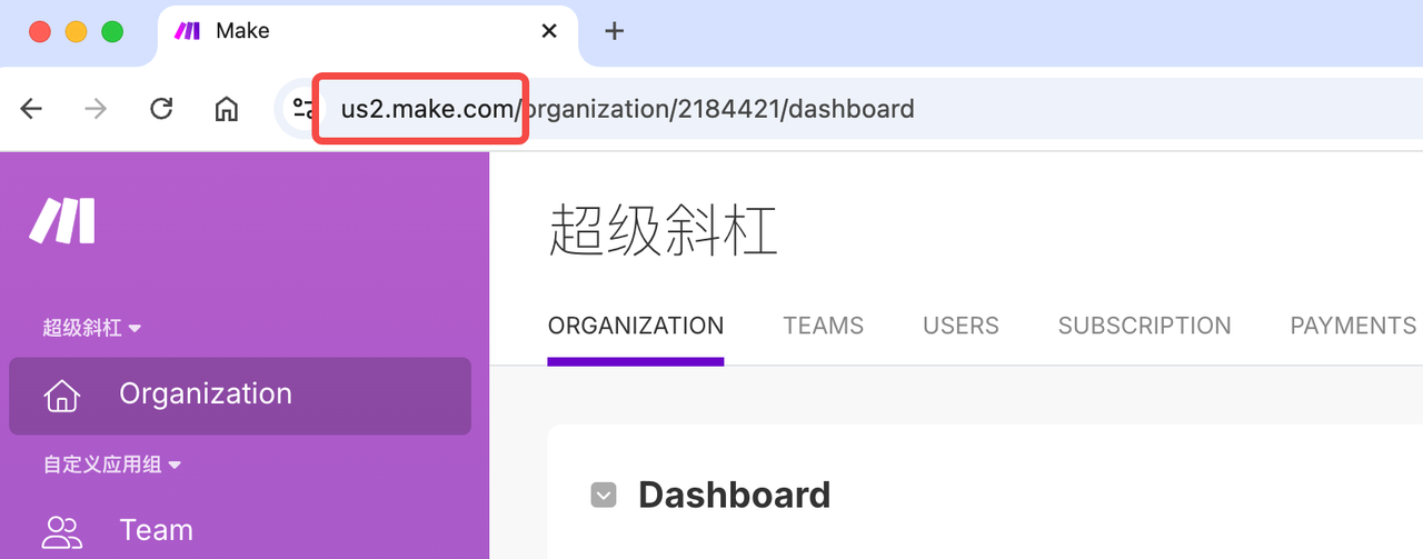 - 查看自己账户的域名开头,有以下几种可能,以下图为例,我的域名开头为:us2.make.com