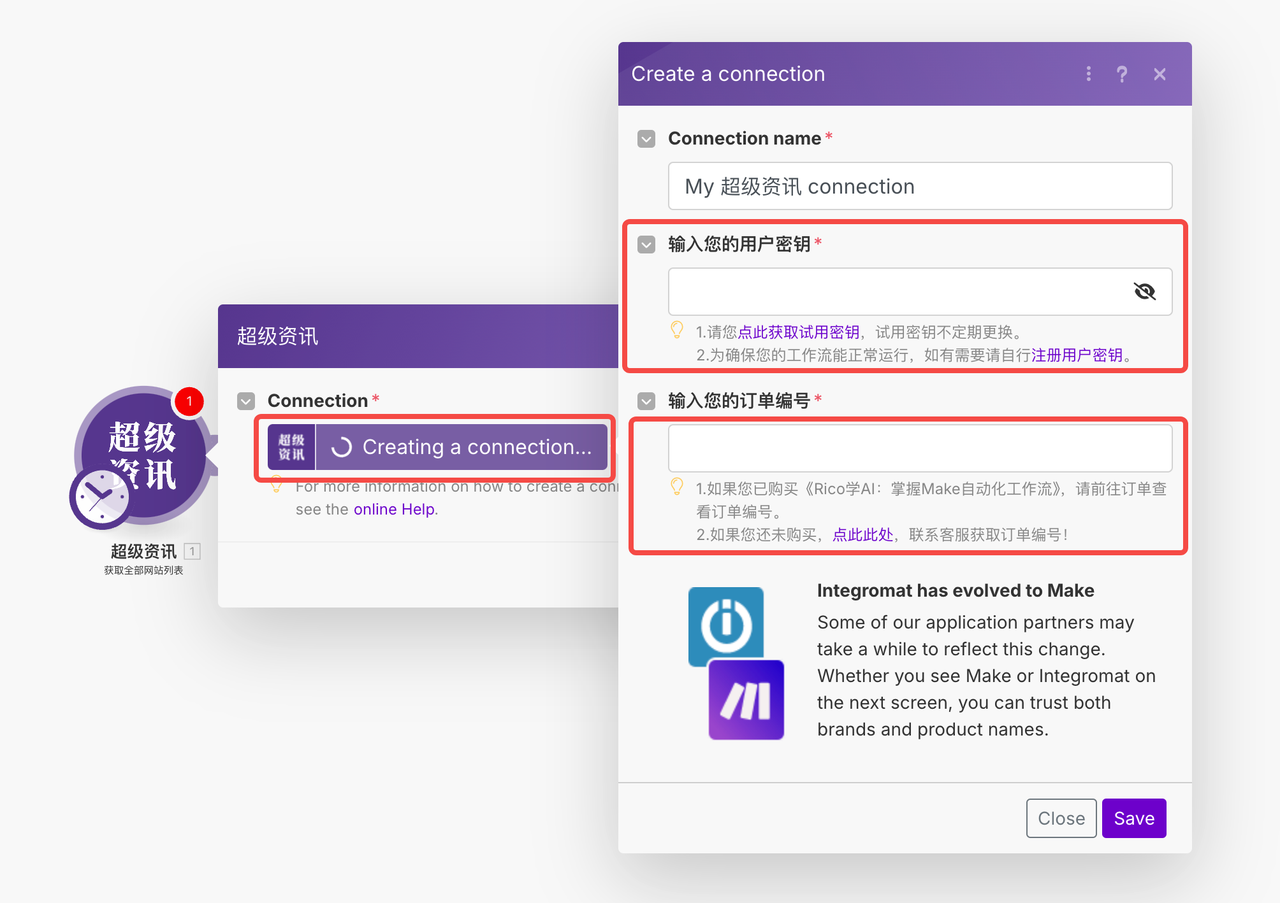 我们加班加点将“超级斜杠AI”上线到Make.com,这个应用无论你是否是我们的超级会员,都可以使用,无需进行会员订单号验证!