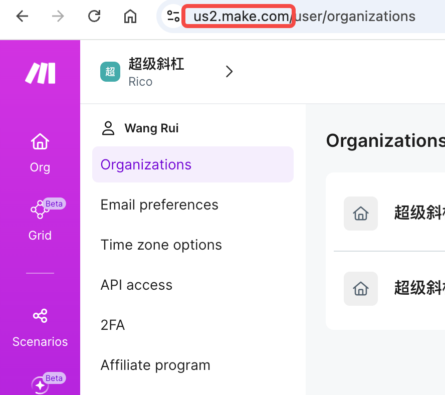 us2.make.com,你的区域就是US2(也可能是 US1, EU1 等)。