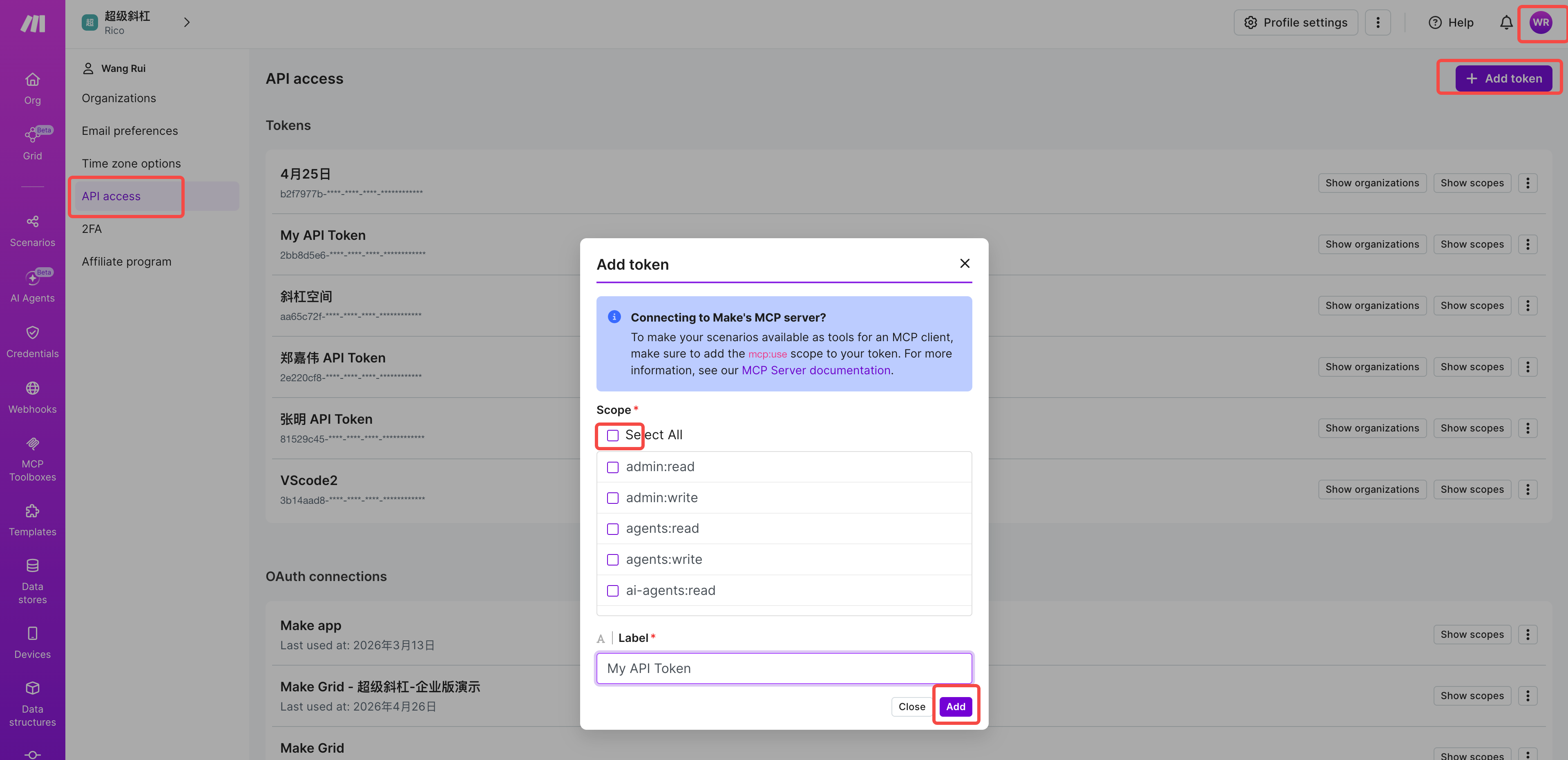 - 在 Make 中点击左下角头像 → **Profile** → **API** 选项卡 → **Add token**。