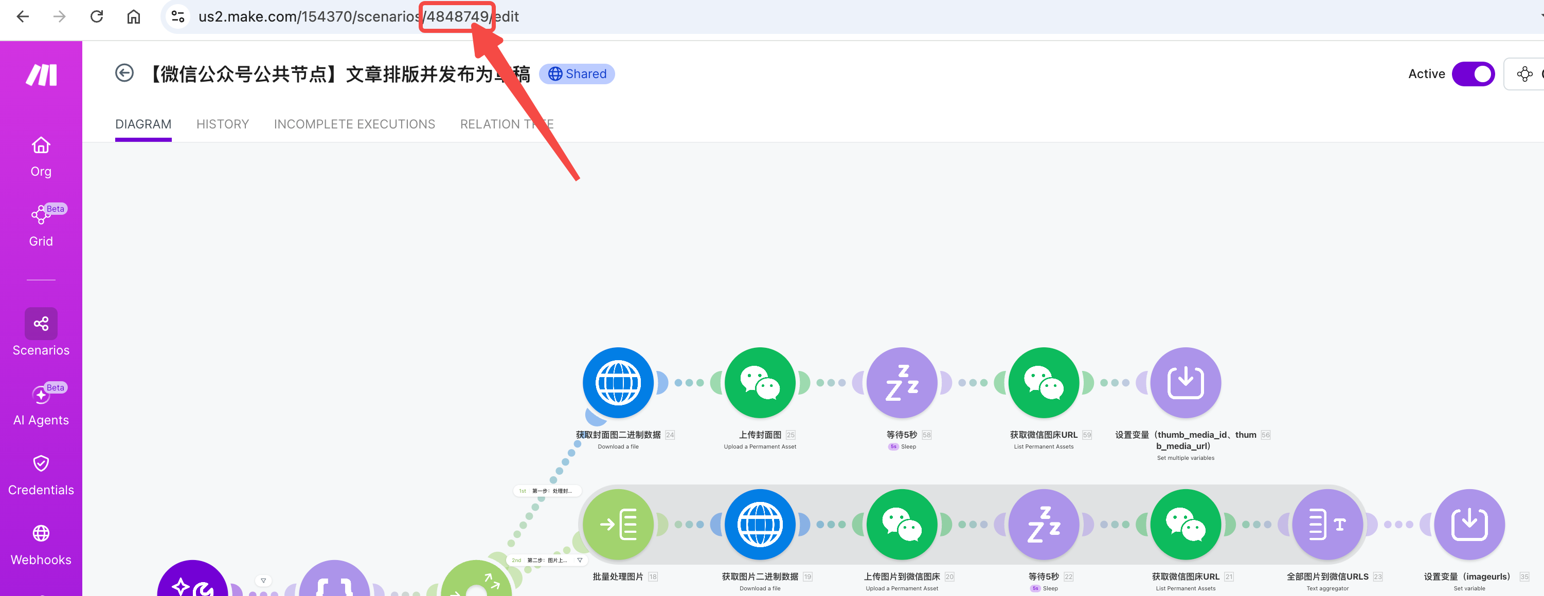 2. **工作流激活**:Make 工作流必须处于已激活(绿色开关)状态才能通过 API 触发。如果工作流处于暂停状态,API 会返回错误。