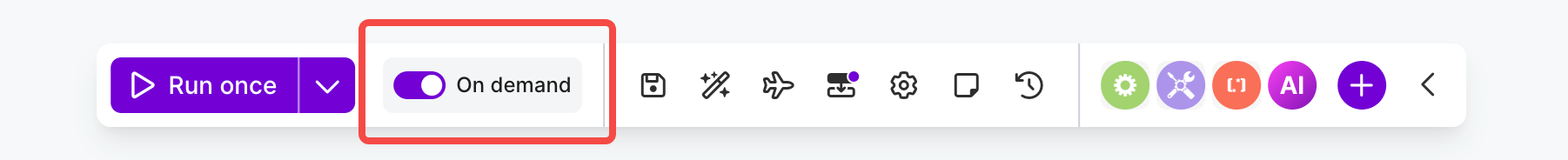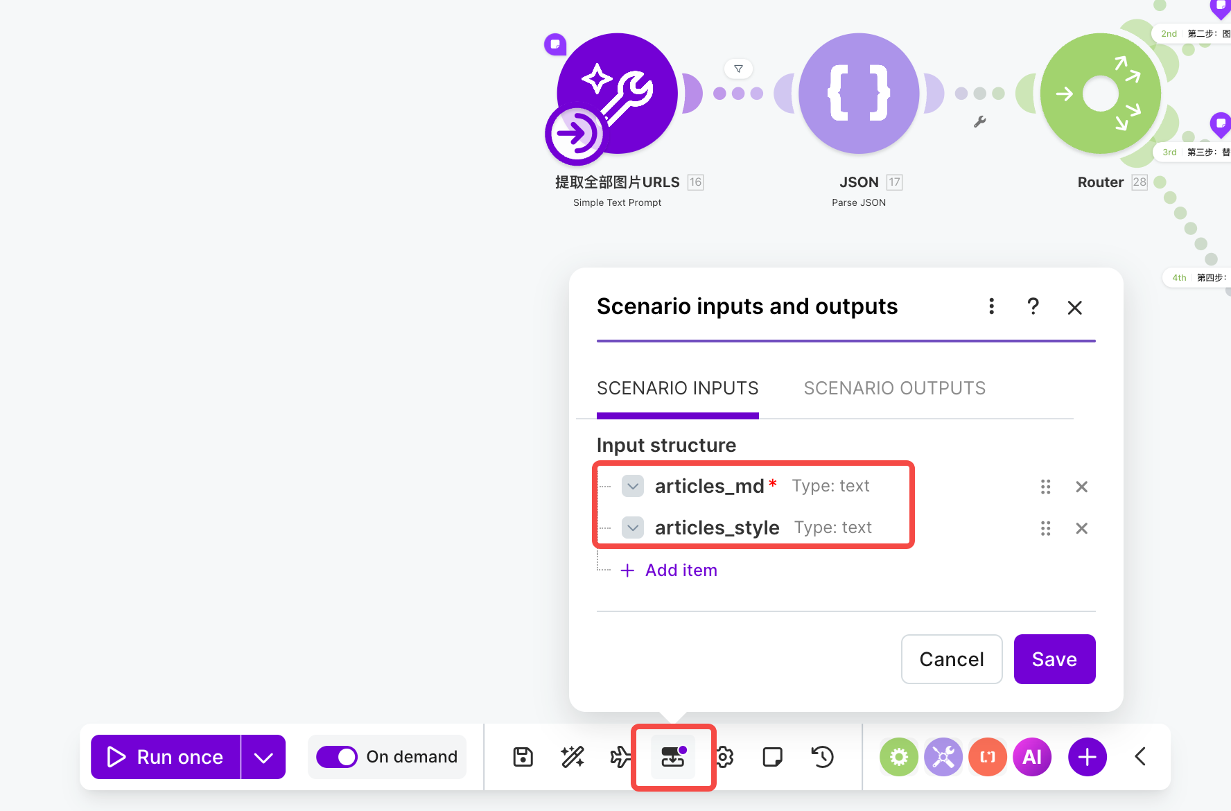 所有模块设置完成后,务必将工作流底部的 On demand 开关打开,然后再点击保存。只有开启这个状态,该工作流才能被外部应用程序(如小龙虾的 Skill)顺利调用。
