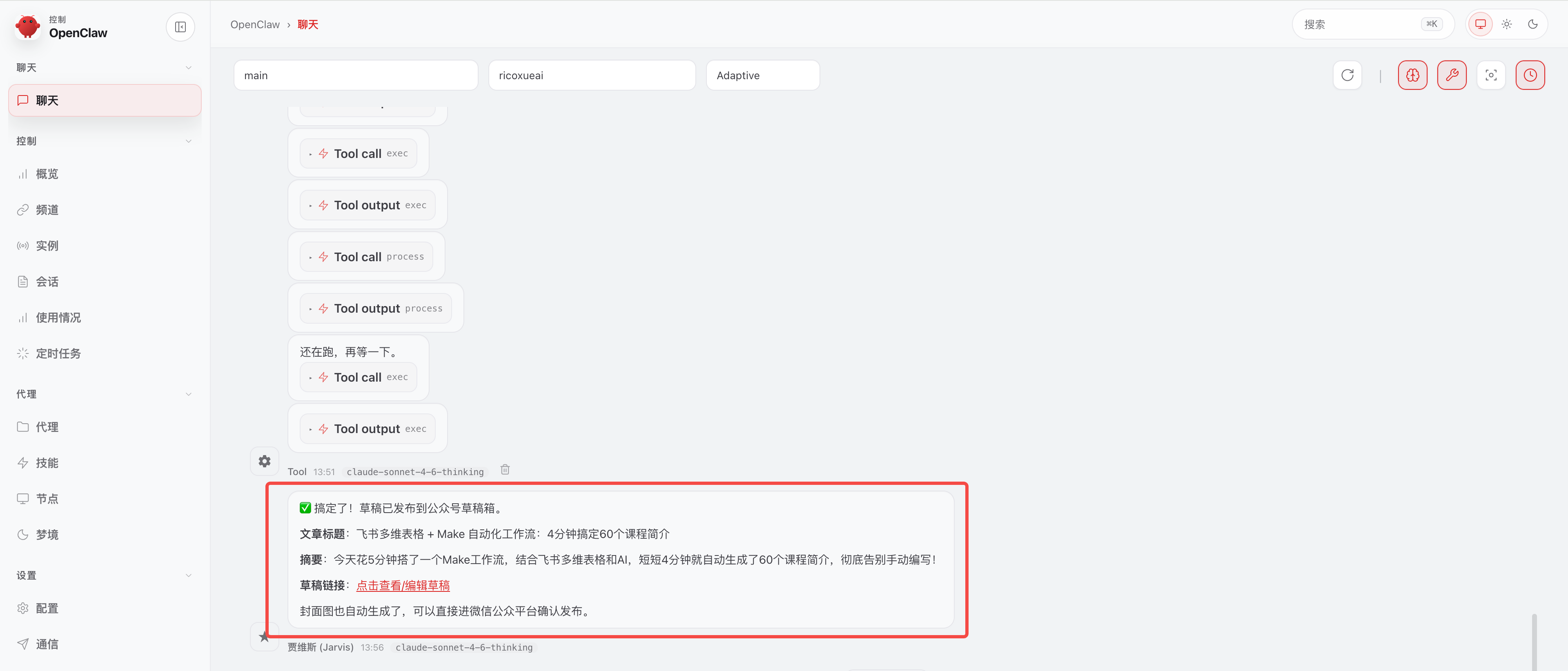 以小龙虾(OpenClaw)为例,我直接把一篇文章的链接发给智能体,并告诉它:“把链接里的文章内容,通过相关技能发布到微信公众号草稿箱”。智能体识别指令后,就会自主调用该 Make 工作流。