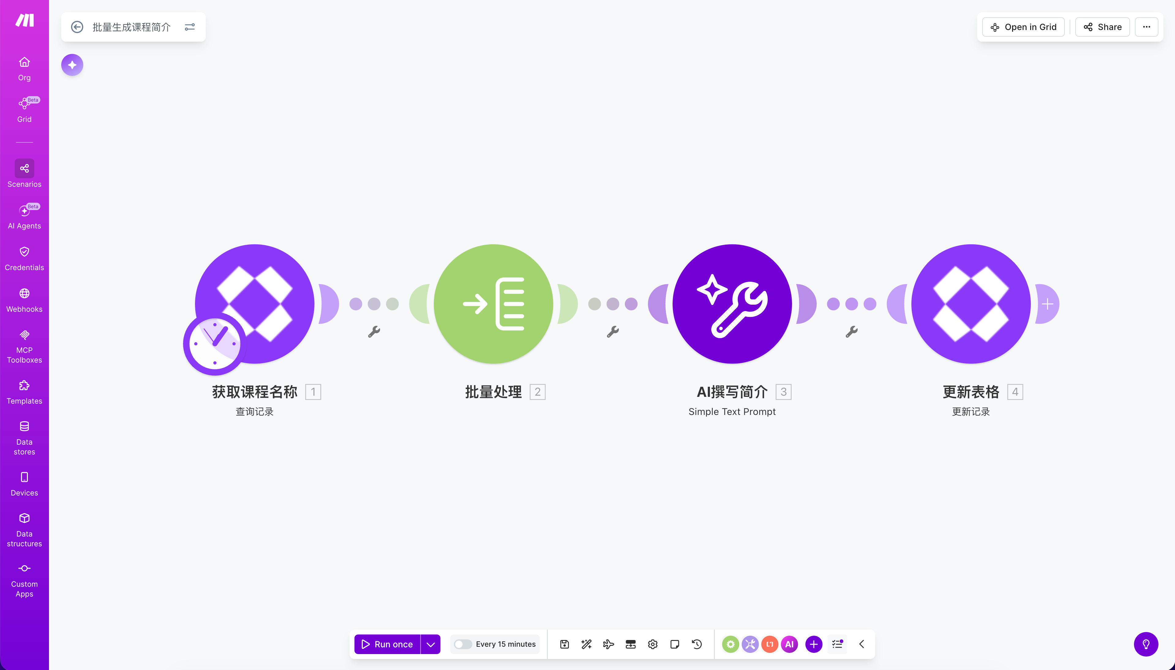 今天花5分钟搭了一个Make工作流,结合飞书多维表格和AI,短短4分钟就自动生成了60个课程简介,彻底告别手动编写!