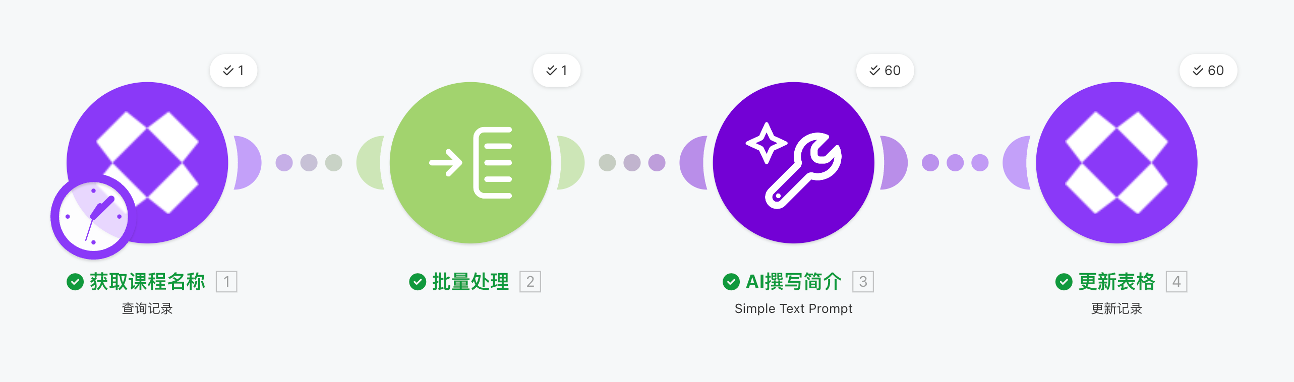 - 1核心结论:今天花5分钟搭了一个Make工作流,结合飞书多维表格和AI,短短4分钟就自动生成了60个课程简介,彻底告别手动编写!