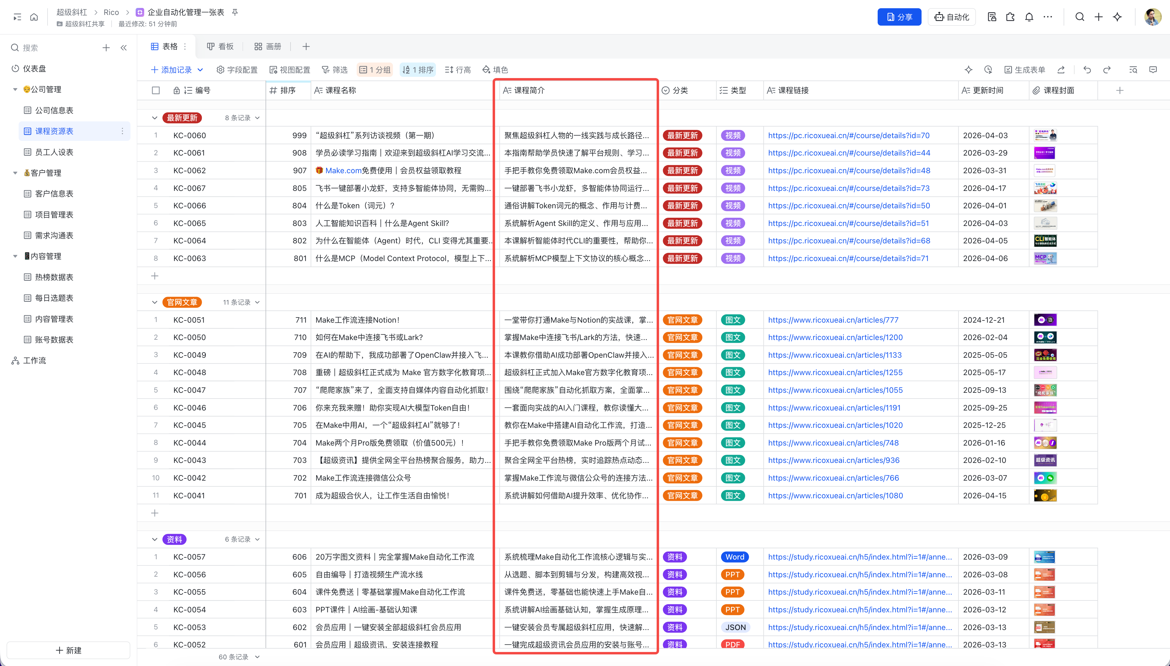 飞书多维表格 + Make 自动化工作流:4分钟搞定60个课程简介