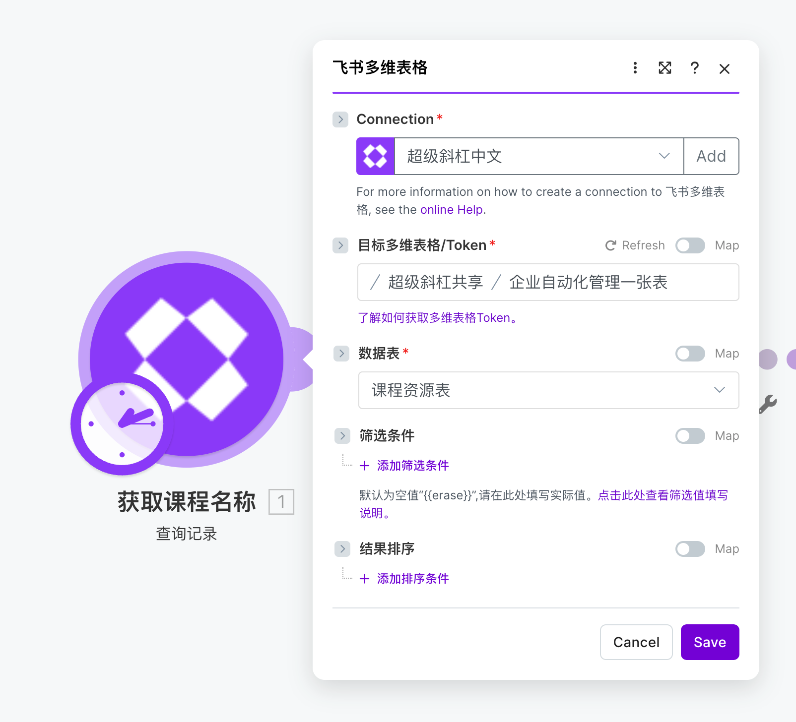 - 查询记录 (Feishu):首先在飞书表格里有课程的名称。我们在设置时,第一个模块使用“查询记录”,找到你相对应的飞书多维表格和对应的数据表,把课程数据批量查询出来。