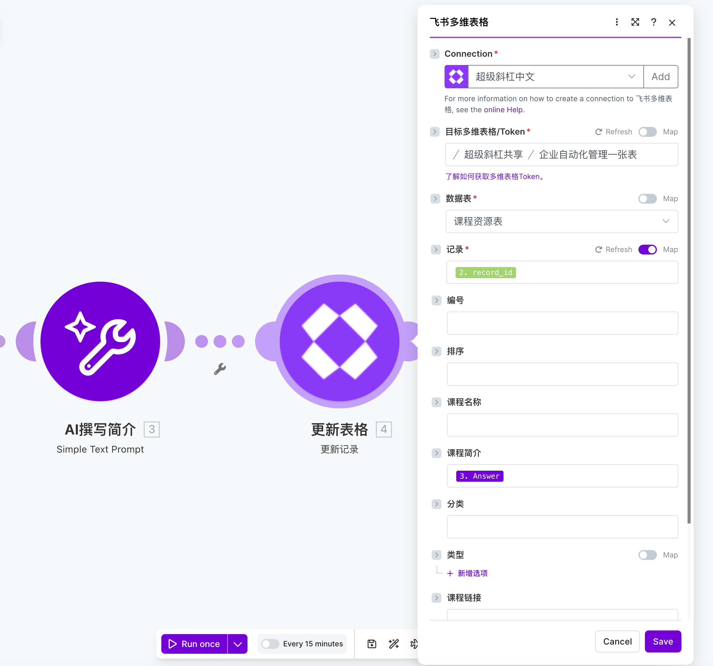 - 更新表格 (Feishu):AI 处理完成之后,我们再把它更新到我们的飞书表格里。在这个“课程简介”字段里,把 AI 模块输出的内容拖到这里来。